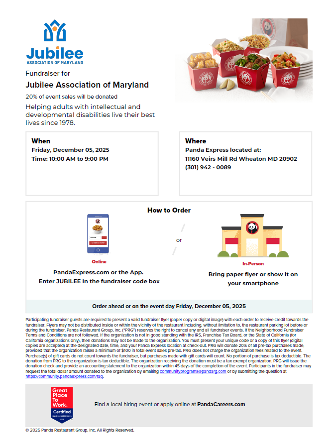 - Panda Express – Viers Mill Rd. Be sure to enter the code JUBILEE when ordering online (pick up only) or show this flyer on your phone when ordering in person. Open 10 a.m.-9 p.m.